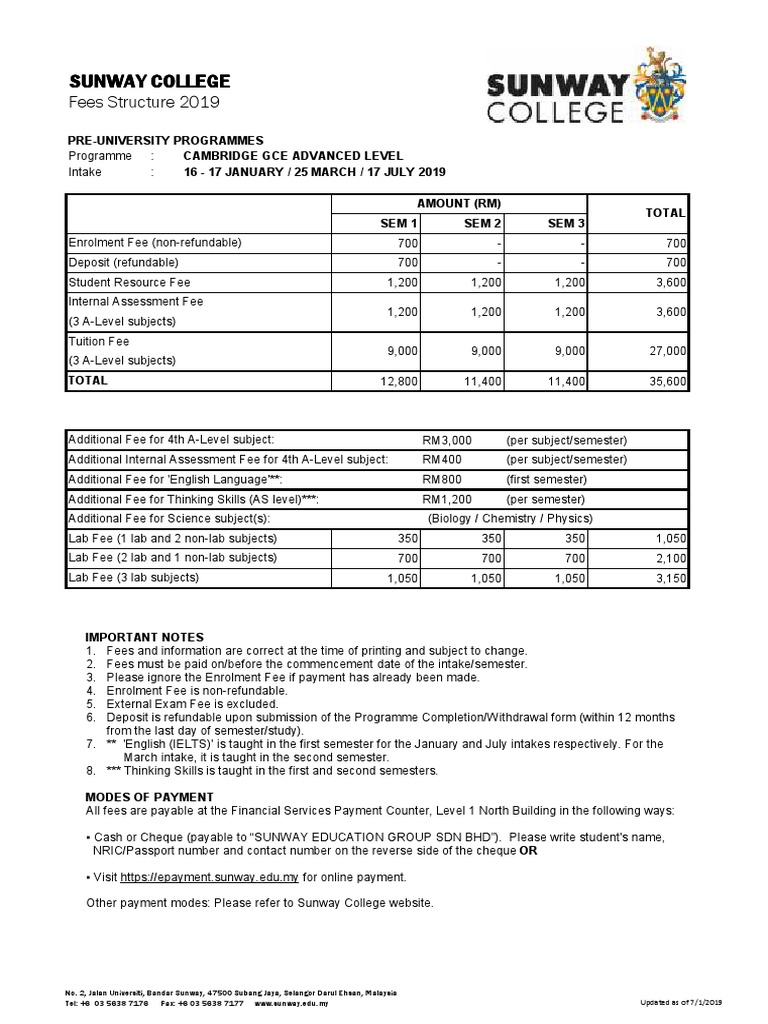 RM 35600 Enrolment Deposit Student Resource Fee Internal assessment fee tuition fee 4 subjects. - Up to RM16000 tuition fee waiver a year - Offered to Sunway students progressing to undergraduate programmes in Sunway University. Twin rooms share room RM2340 per 3 months Single rooms own room share the unit RM3450 per 3 months Single Ensuite rooms own unit RM4950 per 3 months 10 minute walk.